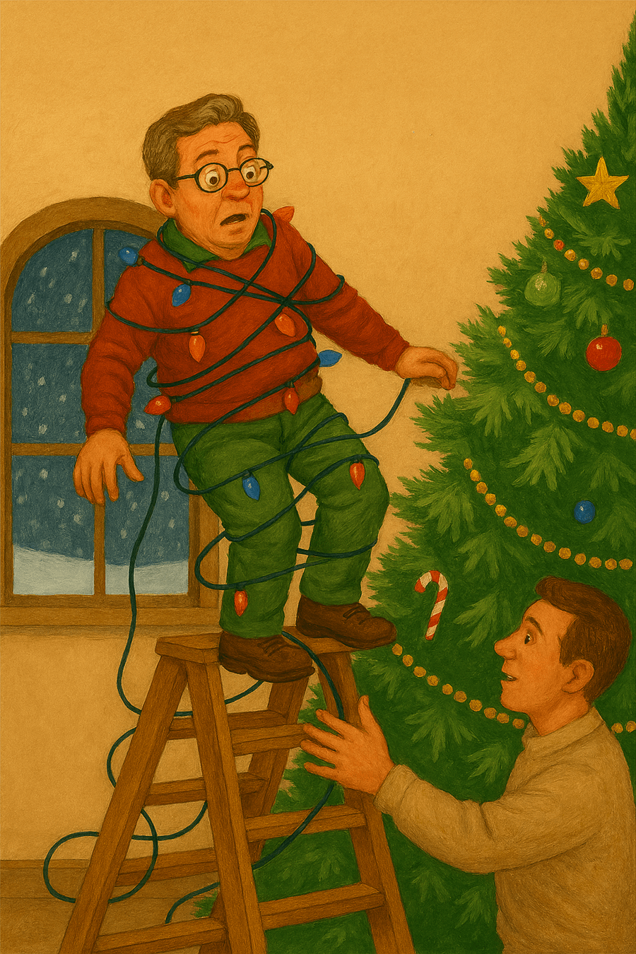 Oh, no, I think I’m stuck! That figures, that’s my luck. Right by the red and blue light, now, I got to free myself, wow, I must be some sight. I got myself tangled in my strings of lights. They tangled around my leg so tight! Help! I’m being held captive by my tree! Anyone out there, can you hear me?