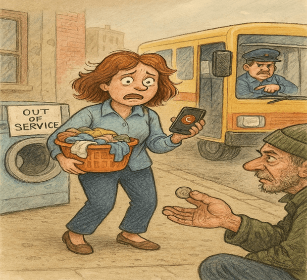 Catching the bus, I don’t have enough change for the two-dollar fare.