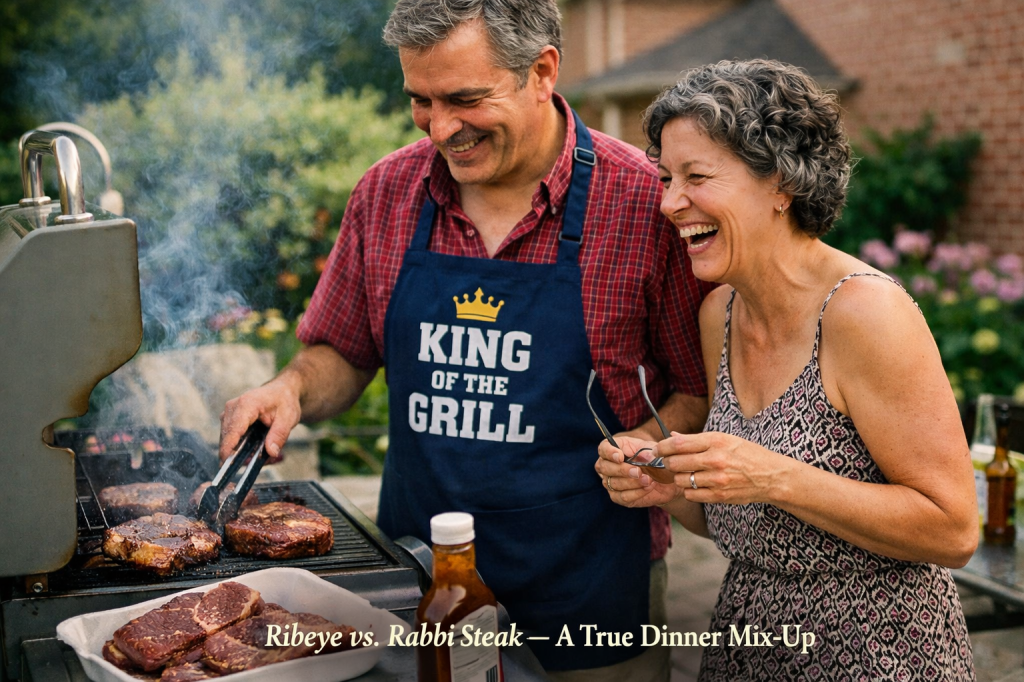 “Sweetheart, may I suggest next time, get your glasses to read what you’re cooking. Rabbis are not ribeyes. There’s no such creature on Earth!”